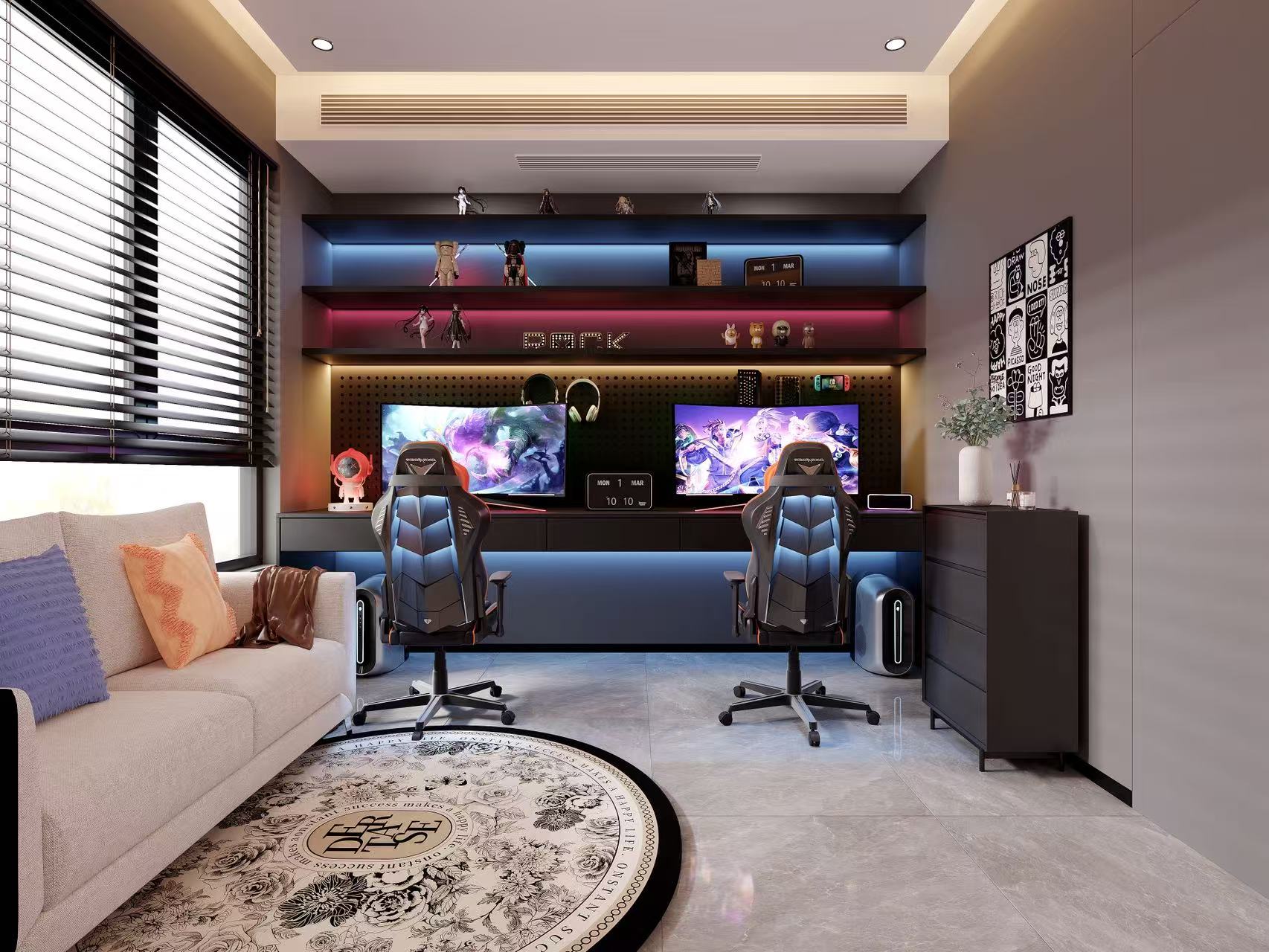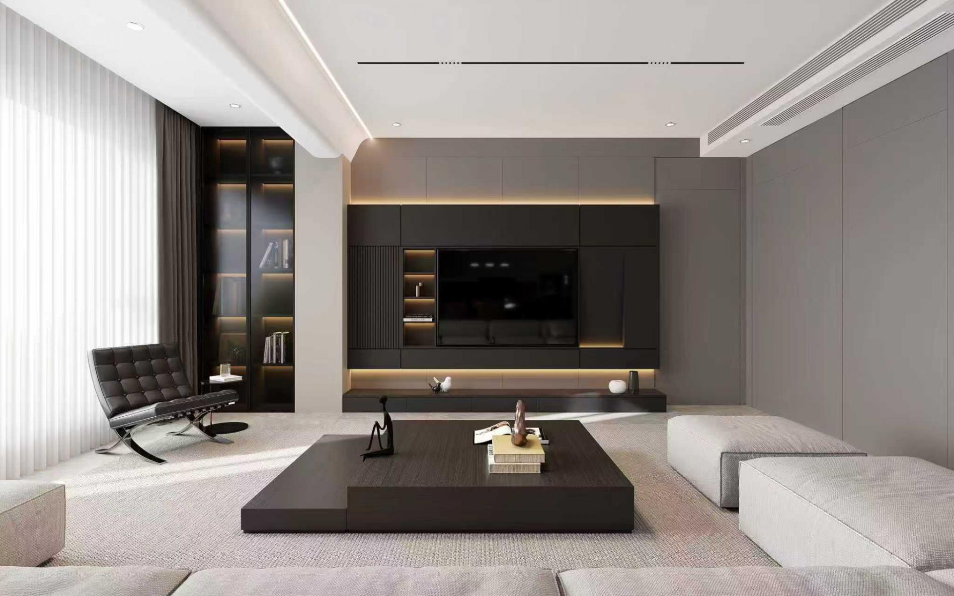 色彩框架:以深棕、炭灰、墨黑為基礎色調,搭配黃銅、古銅等金屬色作為點綴,局部融入淺咖、米白等中性色中和深色的厚重感,形成“深而不悶、奢而不浮”的視覺平衡。